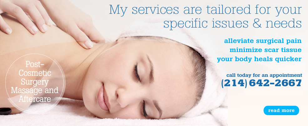 Common Types of SurgeriesLearn about the most common types of cosmetic surgeries I provide aftercare for and their recommended treatment time for optimal healing and aesthetic results. read more | The Importance of AftercareMy specialized techniques remove metabolic waste, excess water, toxins, bacteria and large protein molecules and foreign substances from the tissue. read more | Comfort and ConvenienceMy therapeutic services are conveniently provided in the comfort of your home, my office, or location of your choice. |